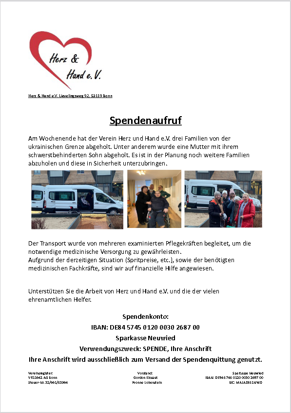März 2022 – Wir wollen helfen? Aufgrund des fürchterlichen Krieges und der unfassbar vielen Leidtragenden haben wir uns entschlossen, uns auch hier einzusetzen. Wir organisieren momentan den Transport von Flüchtlingen aus der Ukraine nach Deutschland. Damit diese Menschen hier endlich zur Ruhe kommen können, sind wir dringend auf Ihre Hilfe angewiesen.
